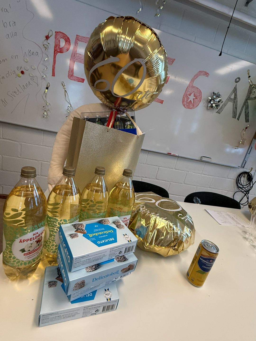 Onsdagen fyllde Klassläraren Pelle 60år och det firade vi på tisdagen med en överraskningsfest. Han blev verkligen överraskad! Måndag kväll pimpade vi i klassen klassrummet så gott vi kunde. Köpte Cider och chokladbollar och blåste upp massvis med ballonger.